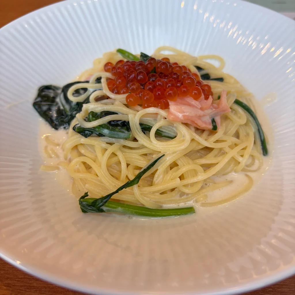 濃厚でクリーミーなソースに、いくらのプチプチした塩気とサーモンの旨みが絶妙にマッチ。